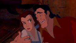 - On an interesting note, most of Gaston's actions were edited out of the final cut of the film: during his battle with the Beast, Gaston was originally intended to shout "Time to die!", but it was changed to "Belle is MINE!" (but his lips still mouth "Time to die!") in order to edit violence and get the main point of his rage straight. Also, Gaston's death scene originally had him stabbing the Beast in the back and willingly falling to his death while laughing maniacally, as if satisfied that if he could not have Belle, then neither would the Beast. Though this was changed to Gaston accidentally losing his footing, it appears to explain why Gaston chose such a dangerous and risky position to wound the Beast despite knowing that it would not help him win Belle's heart.