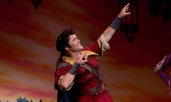 In addition to the song "Gaston", the song "Me" is performed by him (in which he conceitedly proposes to Belle). The song is of interest because one verse implies that his feelings for Belle are more than for her looks (he even calls her 'pumpkin' as an endearing appellative), but he never says it outright to her. In addition, presumably to avoid any implications that the villagers were in the know regarding Gaston's plan to blackmail Maurice, he has all the patrons and staff, except LeFou, leave the tavern before conducting his reprise. The reprise itself was expanded to have Gaston and LeFou brag about Gaston's resourcefulness as well as Gaston fully admitting he doesn't have any remorse to resorting to something as dirty as blackmail to ensure Belle married him, as well as breaking the fourth wall somewhat by having them brag about Gaston being "entertaining" and capable of "keep[ing] up with these endless reprises." Like in the movie, he dies after falling off the roof of the Beast's castle, but not before fatally stabbing him multiple times (as opposed to just once in the movie) after arrogantly lying that Belle sent him to the castle to kill him.